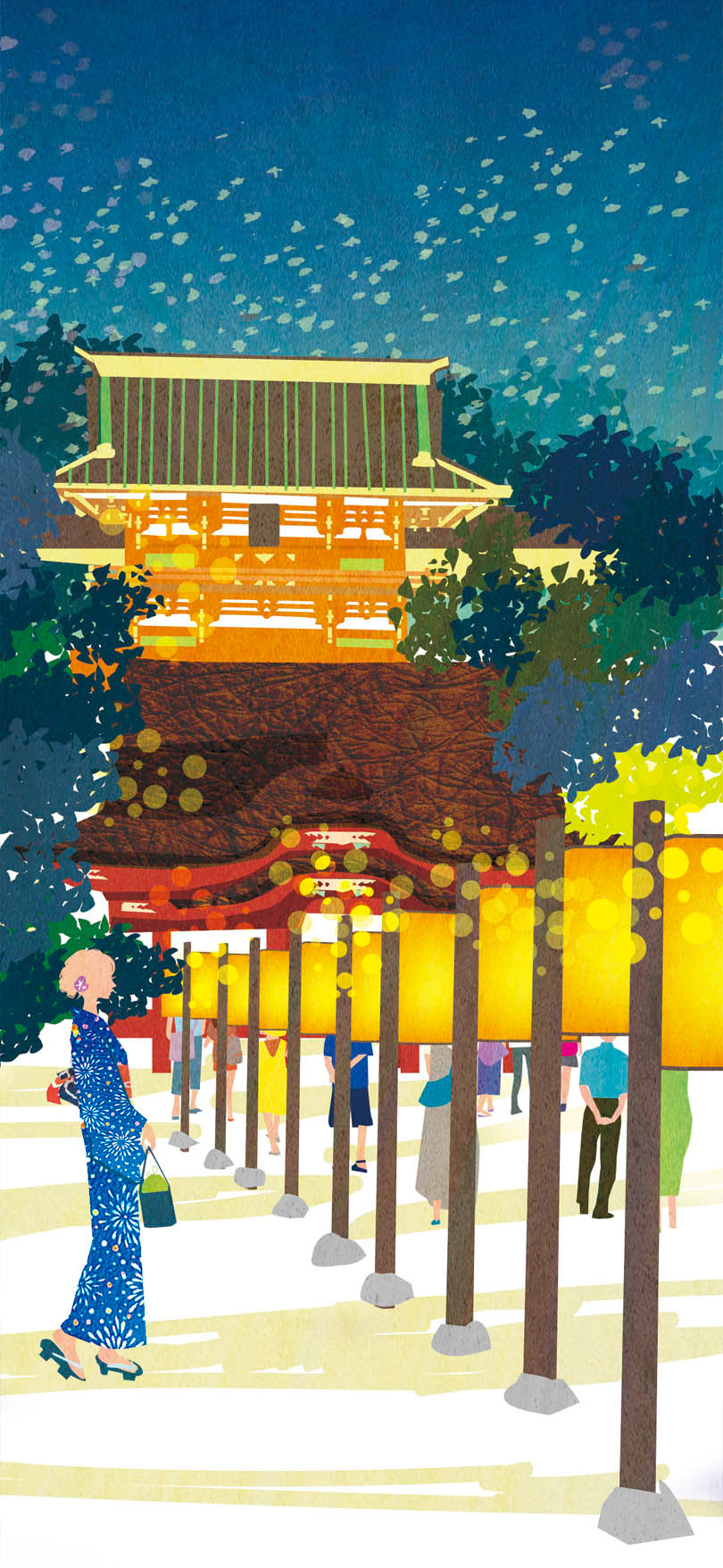 Cover illustration for Kamakura Guide map , Summer 2019 issue. Tsurugaoka Hachimangu ,Bonbori-matsuri